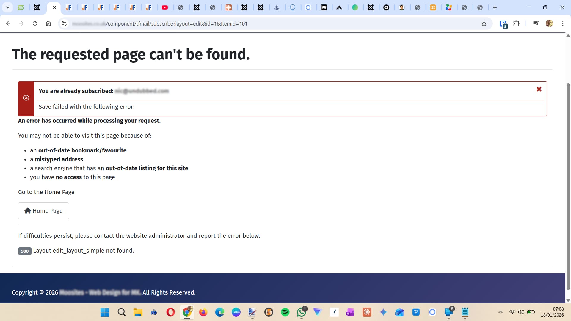 I've successfully installed and published the component, module and plugins. However, whenever I test the subscription module I get an error message (see attached). Even though the message states that the email address is already subscribed the user does NOT exist in Joomla users and is NOT present in the TF Mail dashboard under either Users or Subscribers.