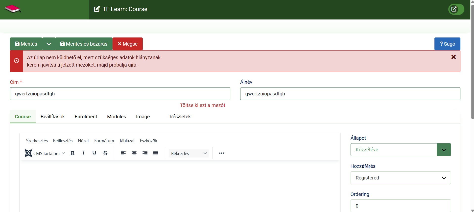 When creating a course, the Title field appears filled in the UI, but its value resets to empty on save. The form then fails HTML5 required validation and cannot be submitted. When I am editing a course, it says saved. But it is not saving for example the order of the modules, in a course page.